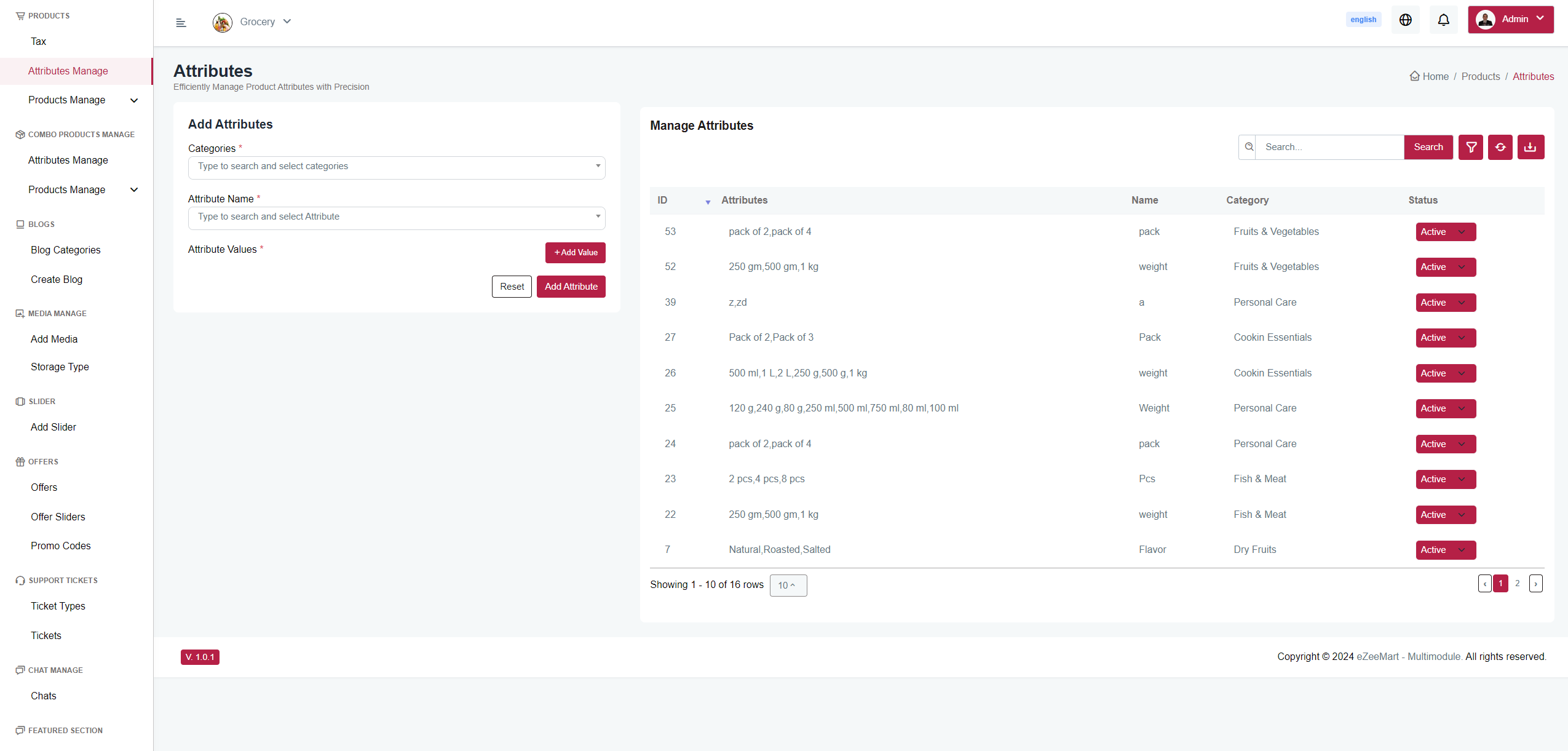 Here, you can add, view, and update the status of attributes. It will manage attributes category-wise. For example, if the category name is weight, you can create attributes like 500 g, 1 kg, 2 kg, and so on