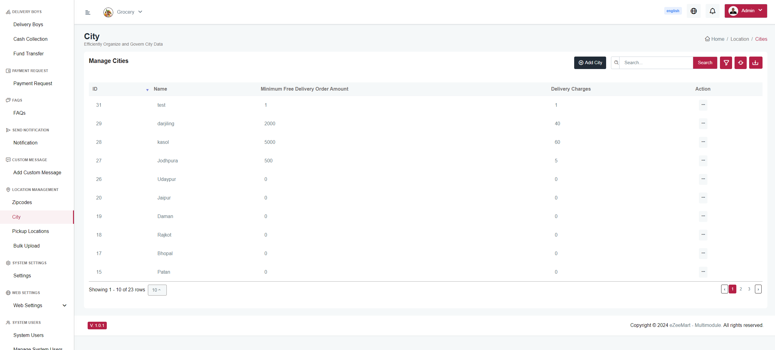 Here, you can create City, set minimum delivery amounts, and specify delivery charges. You can also edit or delete existing cities
