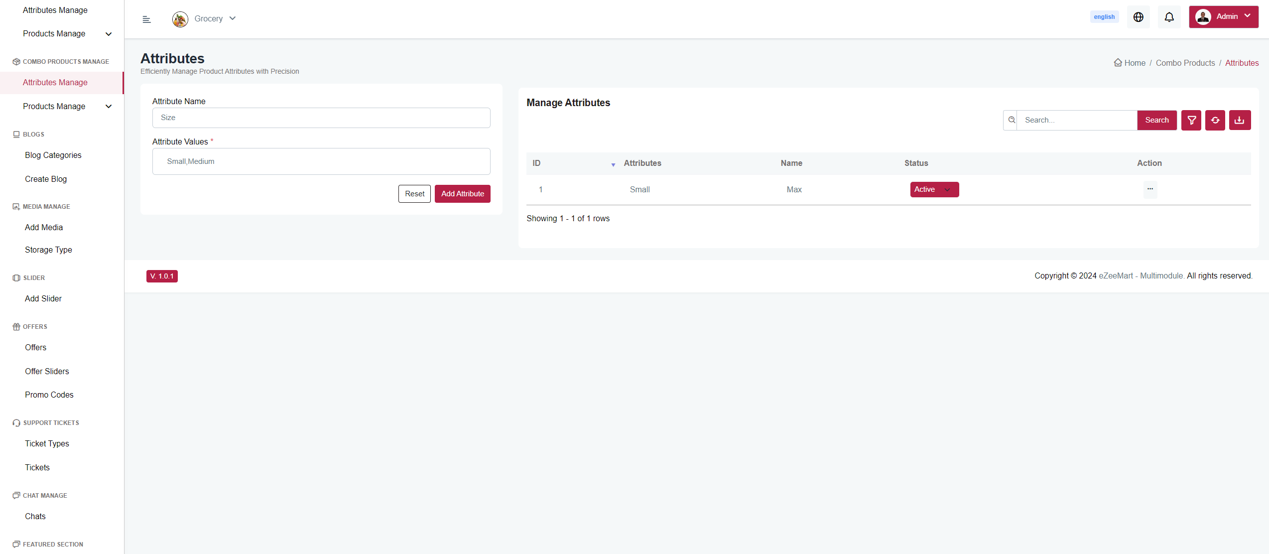 Here, you can add, view, and update the status of attributes .For example,you can create attributes like size - S,M,L, and so on