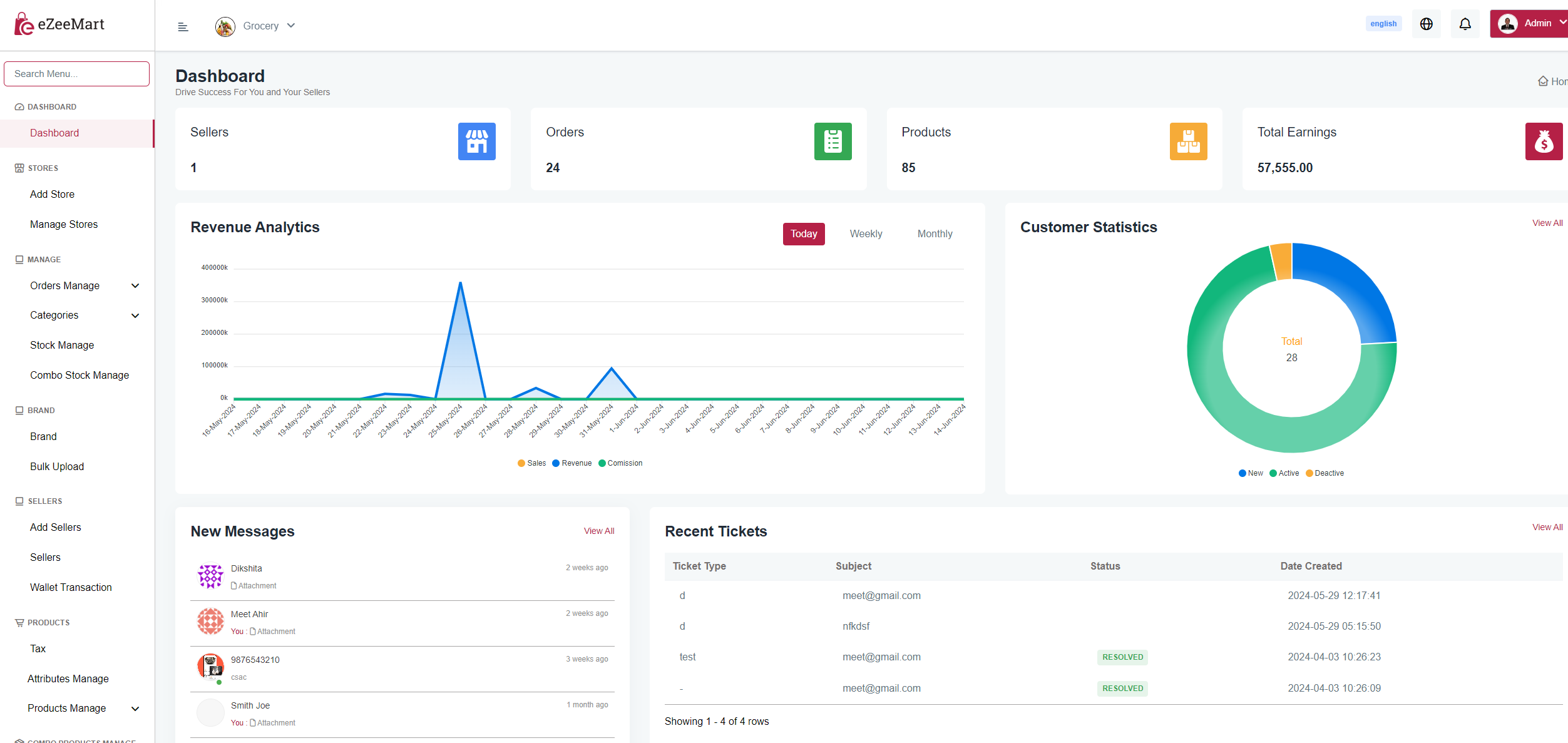 The dashboard contains the sellers, orders and product count and total earnings. It includes recent tickets, recent chats, orders overview, top sellers, and categories. Additionally, it features recent orders, and two charts for revenue analytics and customer statistics.