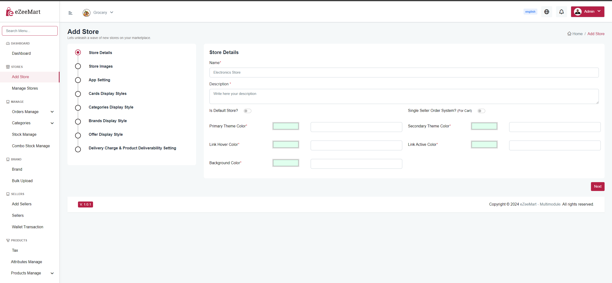 You can create stores that contain the store name, description, store logo, favicon, primary and secondary colors, offers, categories, and display style. Additionally, you can specify the deliverability type, such as city-wise, pincode-wise, or product-wise, and then provide all the store details accordingly. All the features are managed on a store-by-store basis